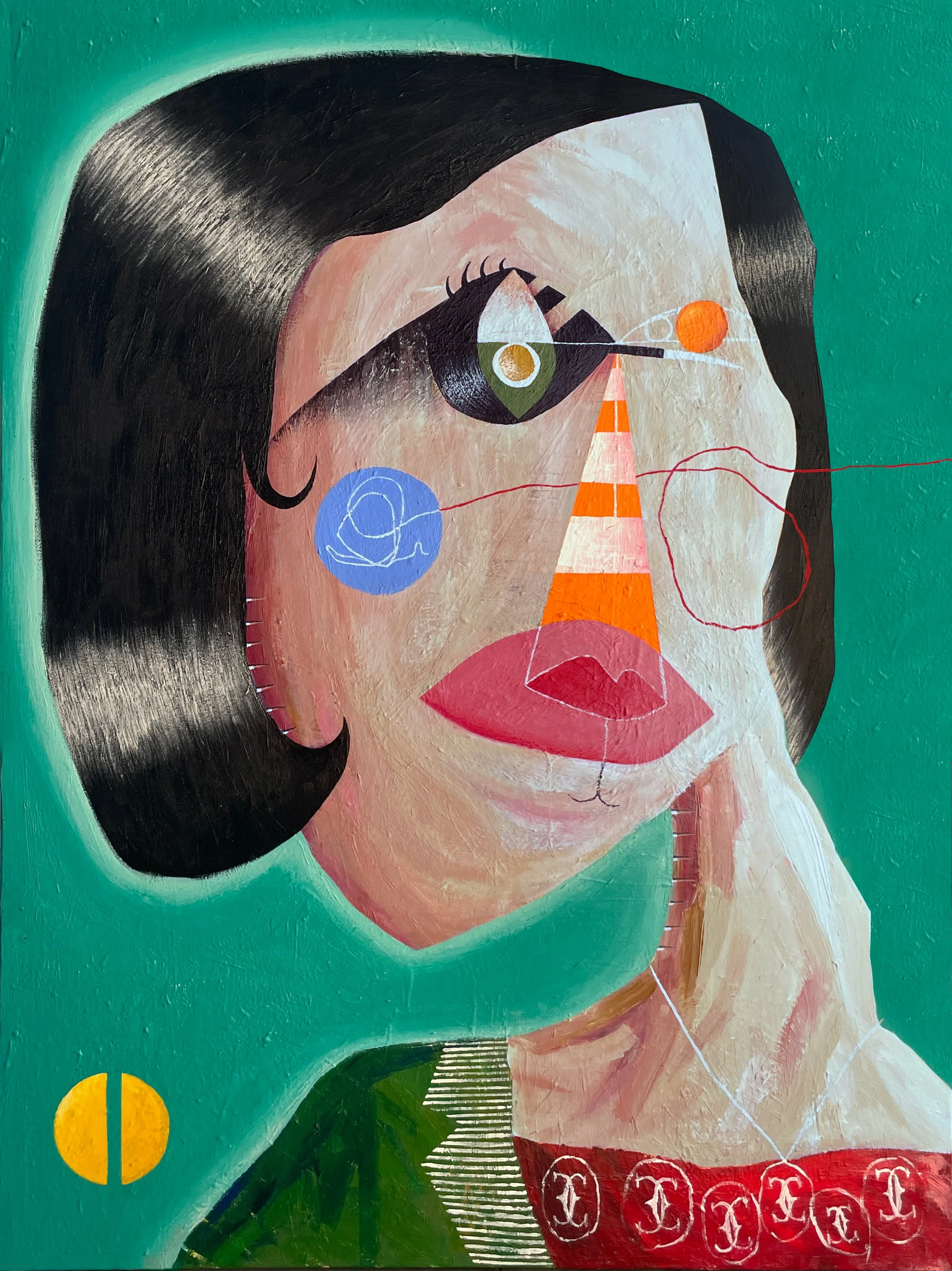I paint instinctively and fast. In a way, my portraits are also about balance, with faces an abstract collection of fulcrums, wires and crescent moons. And while some reference Basquiat on seeing my work (I do love words — blame my advertising background), my own reference points include Miro, Freud, de Lempicka, and American artist Nick Cave. Maybe there is a touch of Patrick Caulfield in there too, though I hope my work is ‘like’ no other.